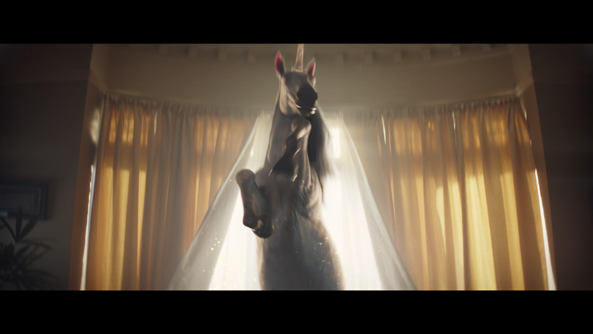 “We want a dinosaur, fighting a unicorn, in a suburban home,” was the rather wonderful brief, so we set about redesigning a T-Rex to make it look less threatening and child-like, as well as developing a majestic unicorn. Modelling, rigging, texturing made these creatures look real, before we took on the shoot, using stand in actors to move objects on set. We then animated the creatures to move within each shot, carefully compositing all of the different layers together to make each scene come alive in a perfect way to help realise the charming (and challenging!) brief.