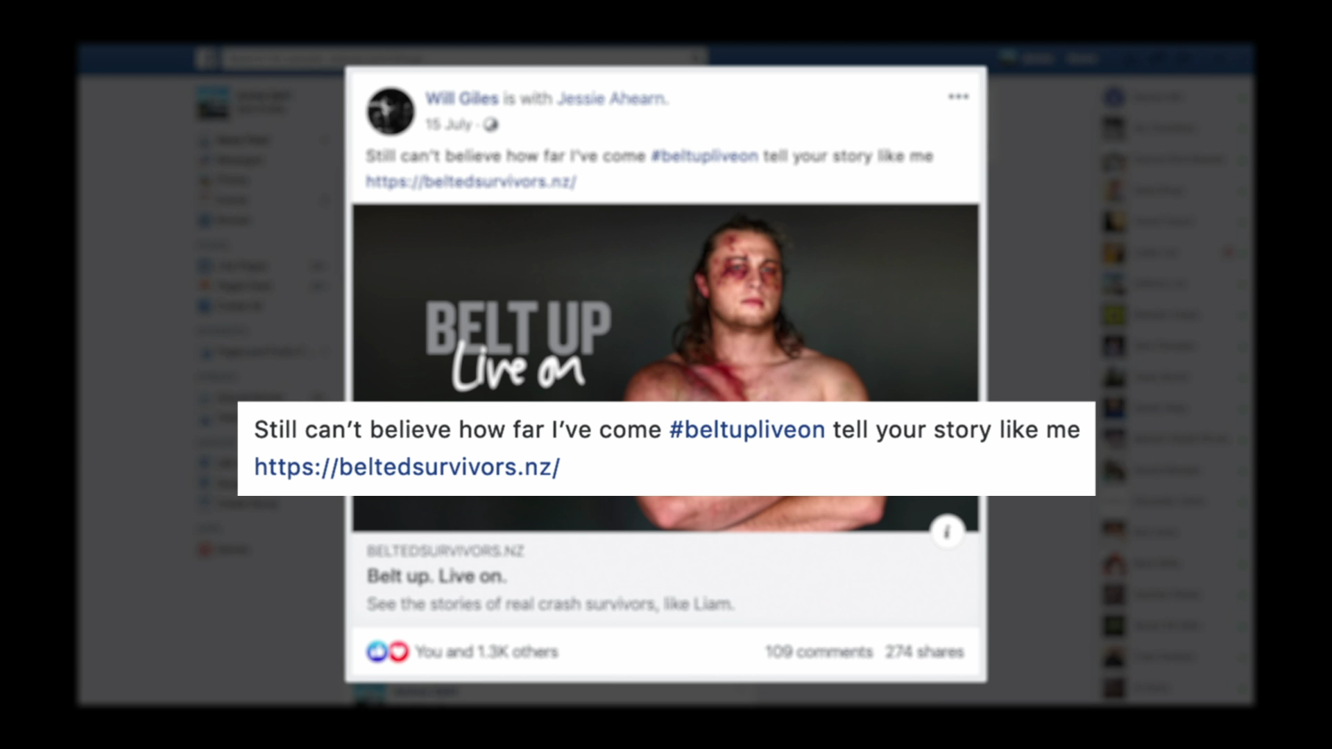 With over half a billion impressions worldwide, Belted Survivors has resonated back where our hard-to-reach audience is centred, in provincial New Zealand. Recall of Belted Survivors is nearly 3x higher amongst young males than the general population. And nearly 4x higher than previous seatbelt campaign recall. For an audience who usually skip or keep scrolling, Belted Survivors saw a 540% increase in audience engagement, compared to NZ Government standards for social marketing to this audience. The campaign also inspired a long-term initiative with the NZ Police, with survivors partnering in the development of workshops focused on seatbelt safety. Their stories have inspired hundreds of others to share their own tale of survival at beltedsurvivors.nz.