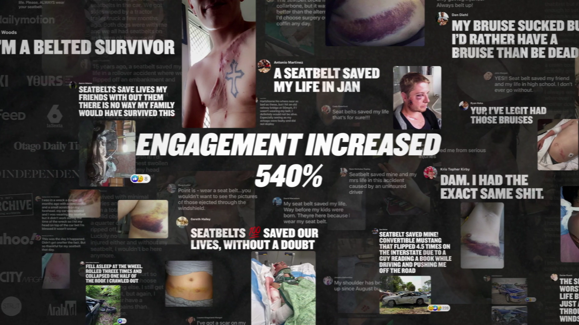 Real crash survivors proudly wore their seatbelt wounds as badges of honour; confronting marks of survival that proved there’s nothing soft about seatbelts. Belted Survivors gave our audience powerful proof they couldn’t deny, delivered over social by peers who’d lived through a crash themselves. Using the real survivors of crashes to authentically deliver our message for us, and transforming crash ‘victims’ into powerful advocates of strength, survival, and of making the right call. Who then encouraged thousands more survivors like them to share their own tales of survival, too. Using the influence of real survivors around the world to encourage their own mates to make a good call like them – and for the first time, making the positive impact a seatbelt can make personally relevant.