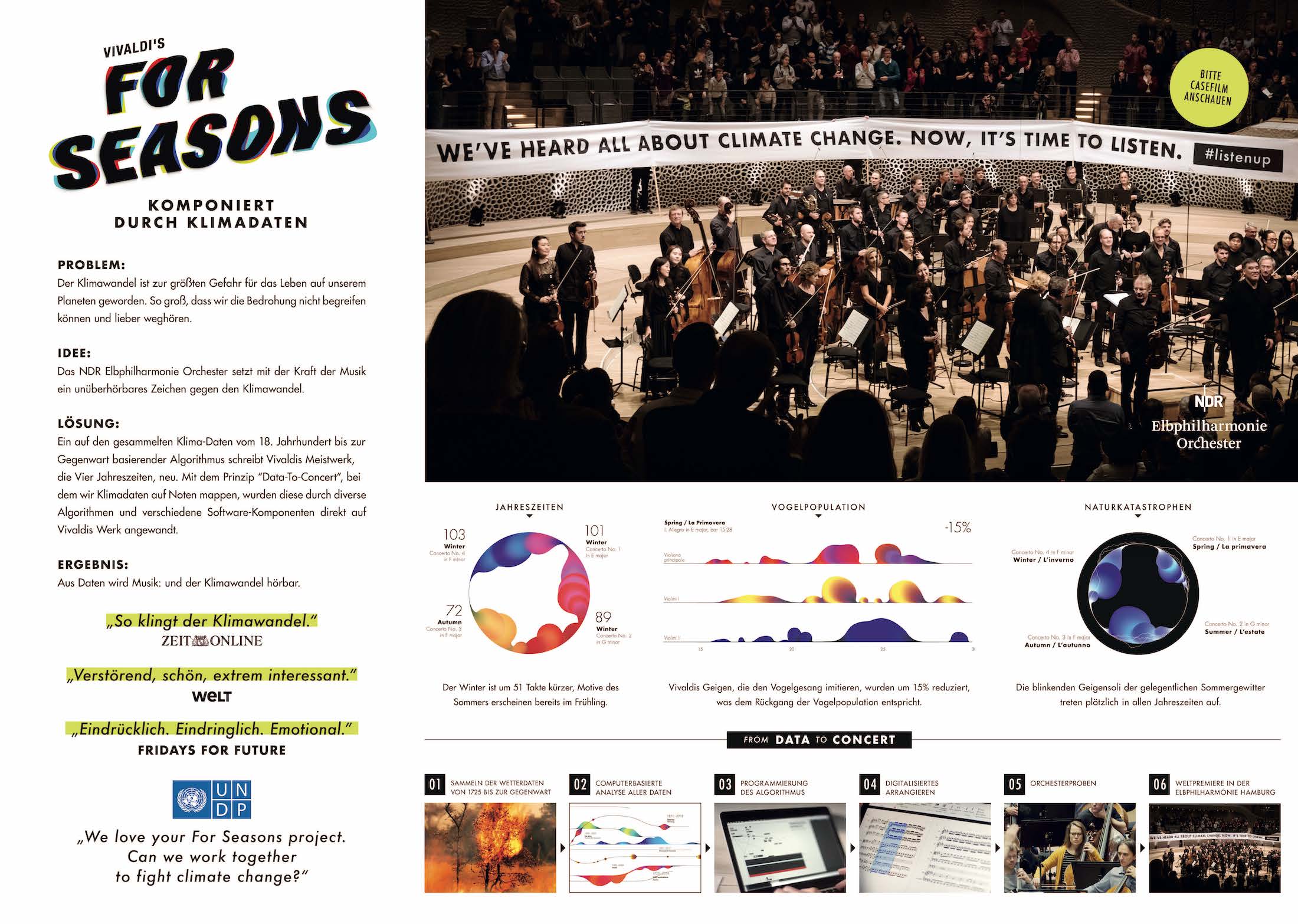 The For Seasons premiered at Elbphilharmonie Hamburg to a sold-out crowd and to 150,000 live viewers on Facebook. The concert ended with a 7-minute standing ovation by a visibly shocked audience. Our message was picked up fast and the voice of climate change was heard by millions. TV & radio stations in 130 countries reported on the concert and Fridays For Future shared our message. In only a month, For Seasons achieved a global reach of nearly 1 billion contacts. Moreover, 2 days after the concert the United Nations reached out to us hoping to “work together to fight climate change”. For Seasons is now partnering with the United Nations Development Program and more concerts are being arranged.