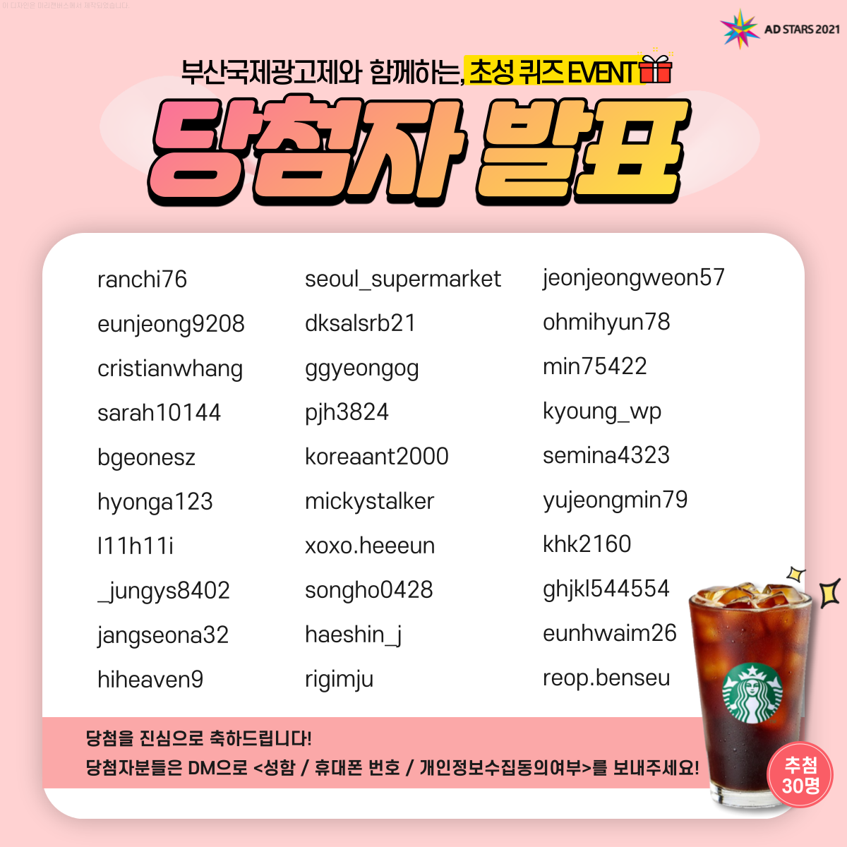 [부산국제광고제 인스타그램] AD STARS 2021 초성 퀴즈 EVENT 당첨자 발표!