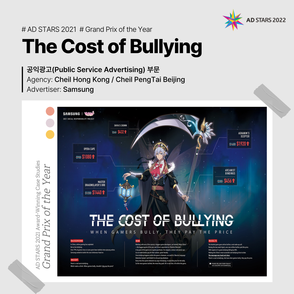 In PSA category, Samsung's "The Cost of Bullying", co-produced by Cheil Hong Kong and Cheil Peng Thai Beijing, was honored.