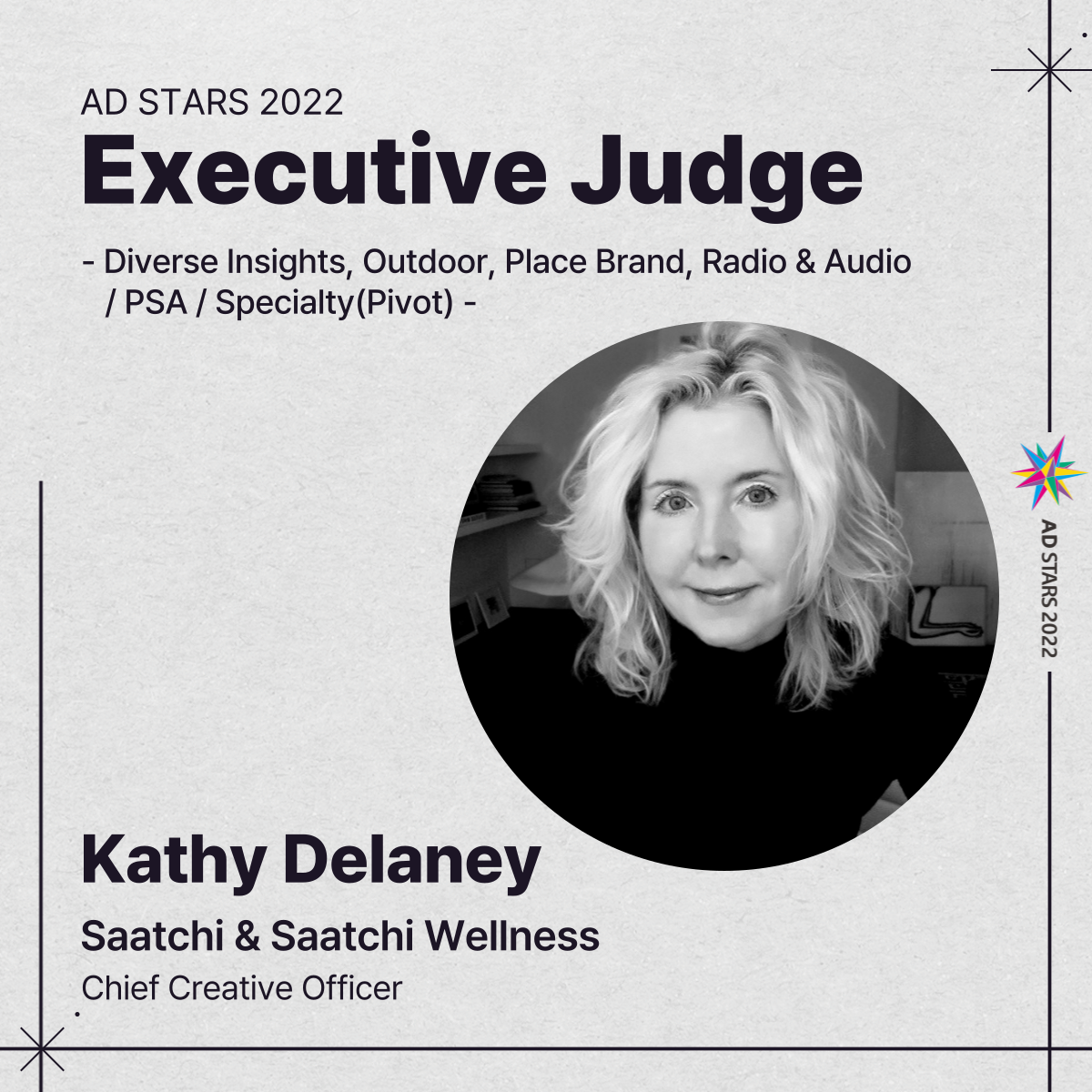 🔸 ‘Kathy Delaney’ is executive judge of the Diverse Insights, Outdoor, Place Brand, Radio & Audio / PSA / Specialty (Pivot) category