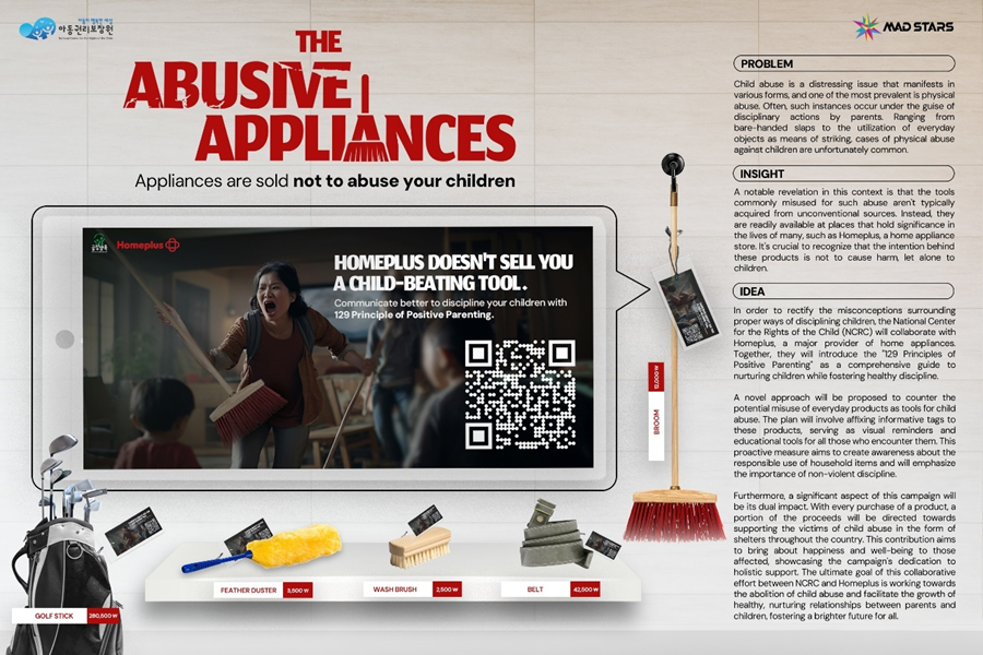 The Abusive Appliances는 일상용품들이 아동을 학대하는데 악용되고 있다는 것을 지적하고, ‘긍정 양육 129가지 원칙’을 소개하기 위해 홈플러스와 협력하고자 고안된 아이디어입니다.
