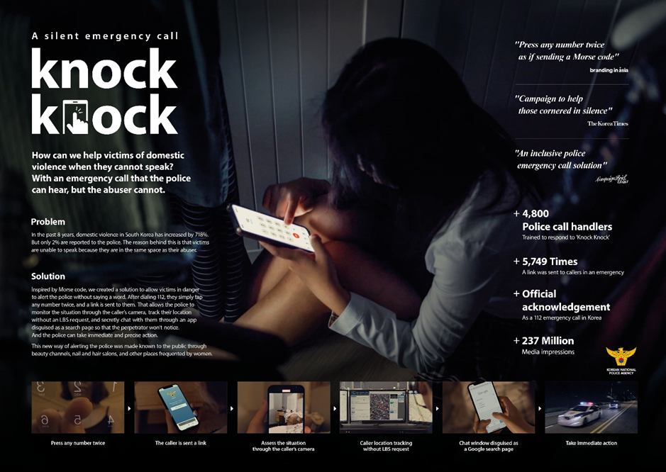 저희는 계속해서 문을 두드렸고, 결국 문은 열렸습니다. 정부에서 수천개의 옥외 미디어에 캠페인을 상영하면서 우리 캠페인은 전국적으로 빠르게 퍼져 나갔습니다. 결국 ‘똑똑’ 캠페인의 효과와 그 유용성을 인정받으면서 한국의 공식적인 긴급 신고 시스템이 되었습니다.