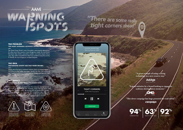 Most people listen to music while driving, especially on long drives over holiday break periods. Creating and listening to a road trip playlist is deeply embedded in Australian culture and what used to be done on cassette tapes and CDs, now happens mostly on Spotify. AAMI data revealed a weakness in insurance sales to young drivers. However, Australians under 30 are most likely to have a fatal car crash. This audience is almost exclusively listening to Spotify’s mobile app, with more than 60% using the free ad-funded platform. It made sense to partner with Spotify to deliver our message. Rather than blanketing road safety messages that are easy to forget, AAMI Warning Spots are designed to hit the right audience at the right time and the right place forcing them to pay attention.