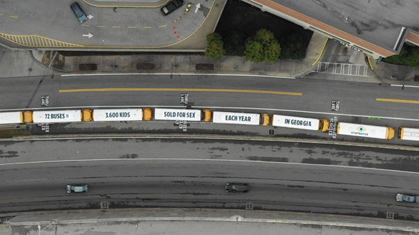Our approach was based on 2 insights: First, sex trafficking of young girls is a horrific problem in Atlanta that no one wants to talk about. Second, highway traffic is also a problem in Atlanta, but everyone loves to talk about that! So, we used the conversation around highway traffic to get people talking about child sex trafficking. To change the conversation, we pulled a big stunt: 72 school buses driving in a caravan right through midtown Atlanta, each representing 50 of the 3,600 Georgia kids at risk of being sex trafficked.