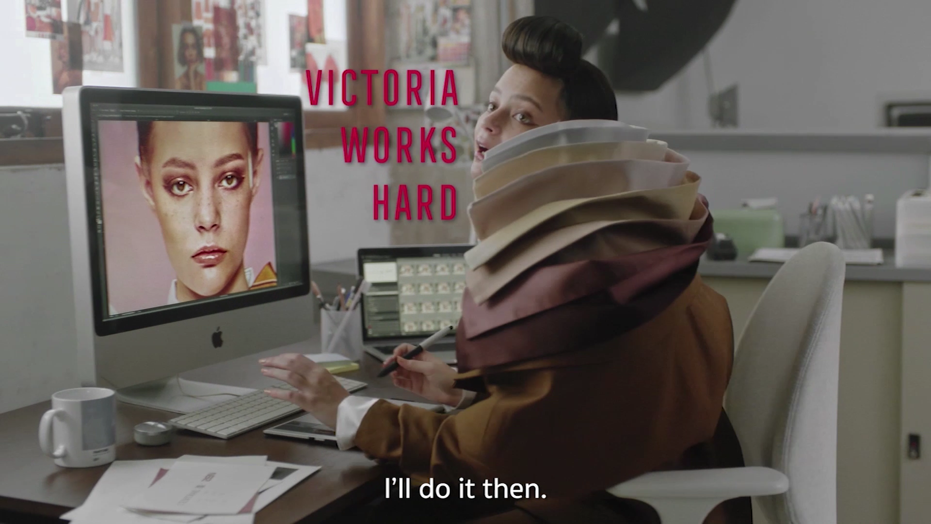 빅토리아는 모델이라는 일이 끝나자 말자 옆 사무실로 뛰어가 사진편집을 시작하는데요.