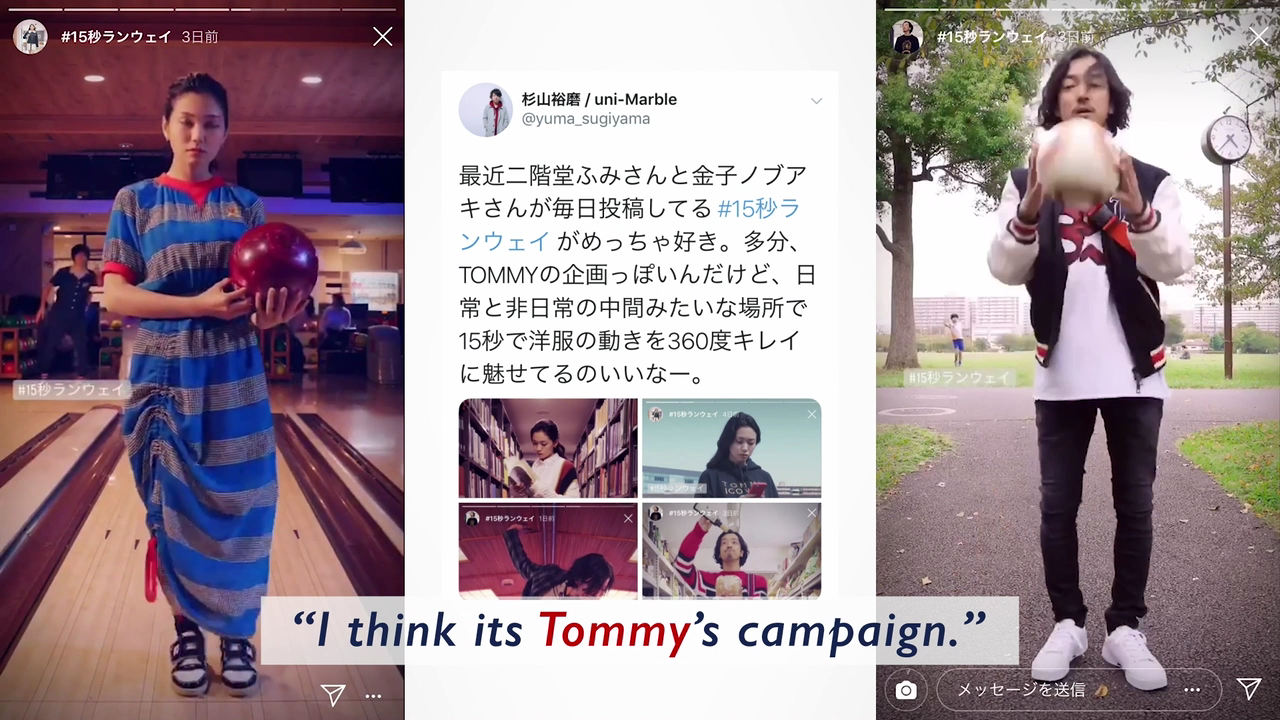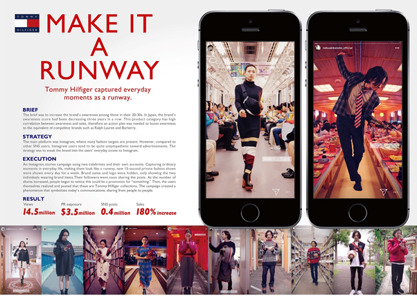 An Instagram stories campaign using two celebrities and their own accounts. Capturing ordinary moments in everyday life, making them look like a runway, new 15-second private fashion shows were shown every day for a week. Brand name and logo were hidden, only showing the two individuals wearing brand items. Their followers were soon sharing the posts. As the number of shares increased, people began to notice this could be a promotion for "something." Then, the users themselves realized and posted that these are Tommy Hilfiger collections. The campaign created a phenomenon that symbolized today's communications; sharing from people to people.