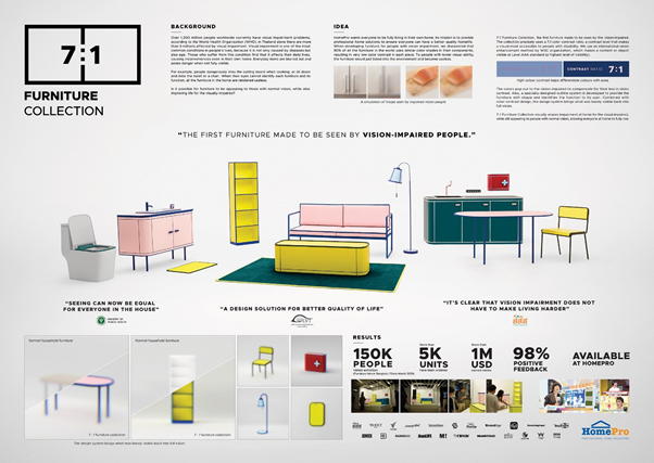 7:1 Furniture provides a better homelife experience for the first time to vision-impaired people. The furniture provides not only a clearer vision but also reduce the household accidents caused by vision impairment. 7:1 Furniture collection strengthens HomePro's mission to provide a full living experience for everyone in their own home no matter who you are.