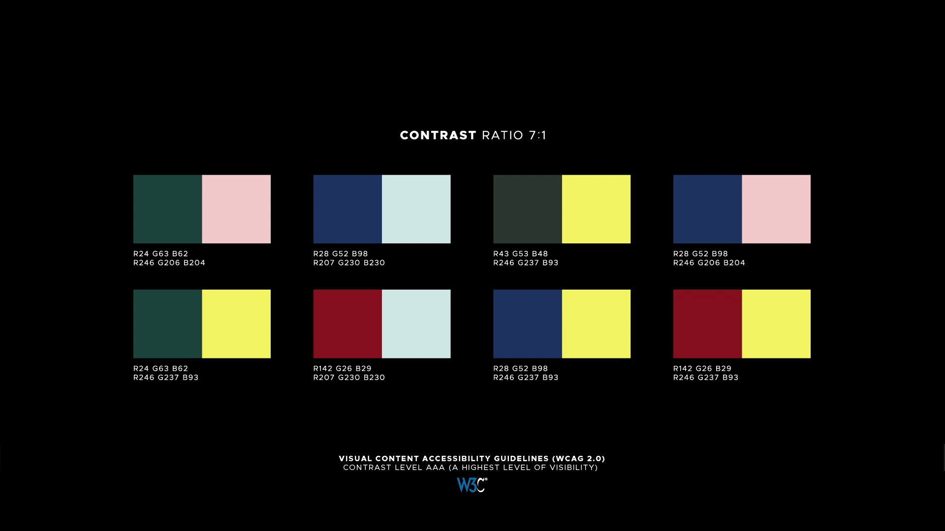 The collection precisely uses a 7:1 color contrast ratio, a contrast level that makes a visual most accessible to people with disability. We use an international vision enhancement method by W3C organization, which makes a content or object visible at Level AAA standard (a highest level of visibility).