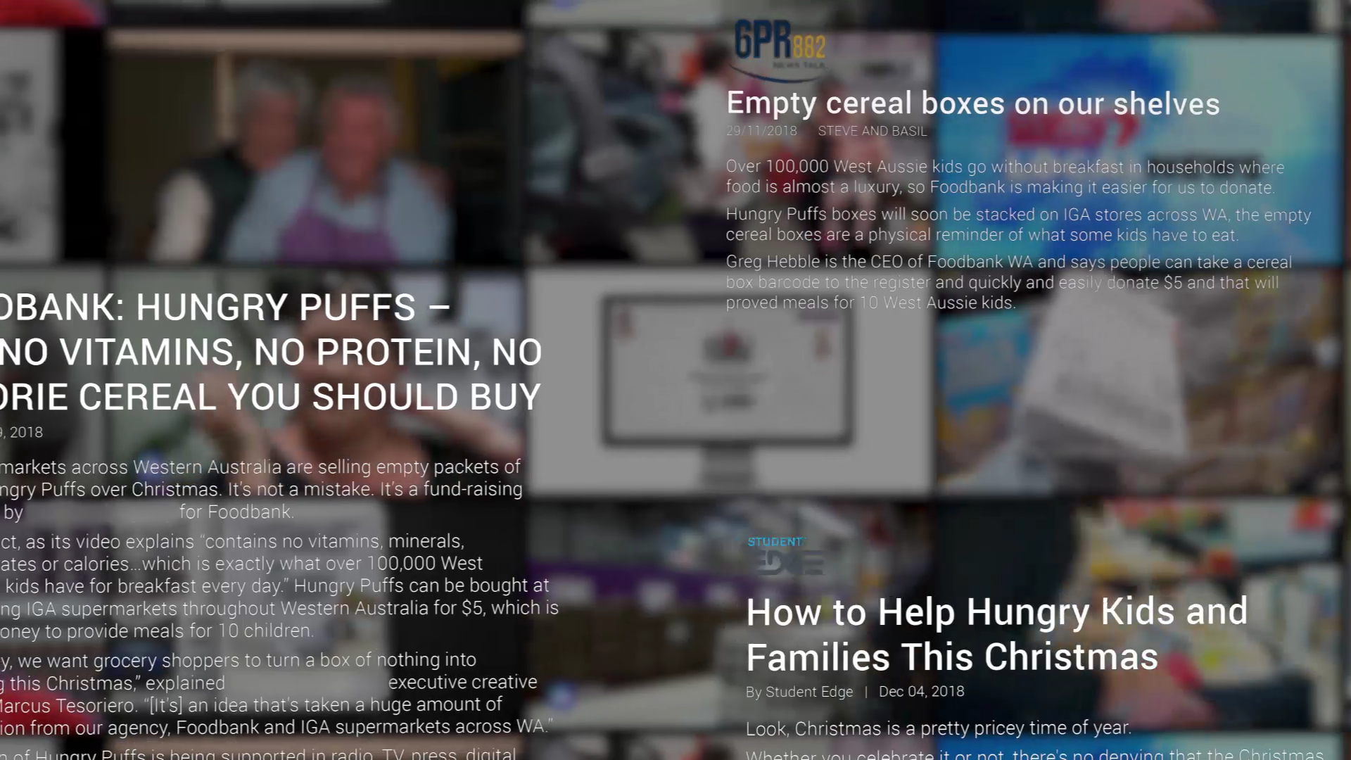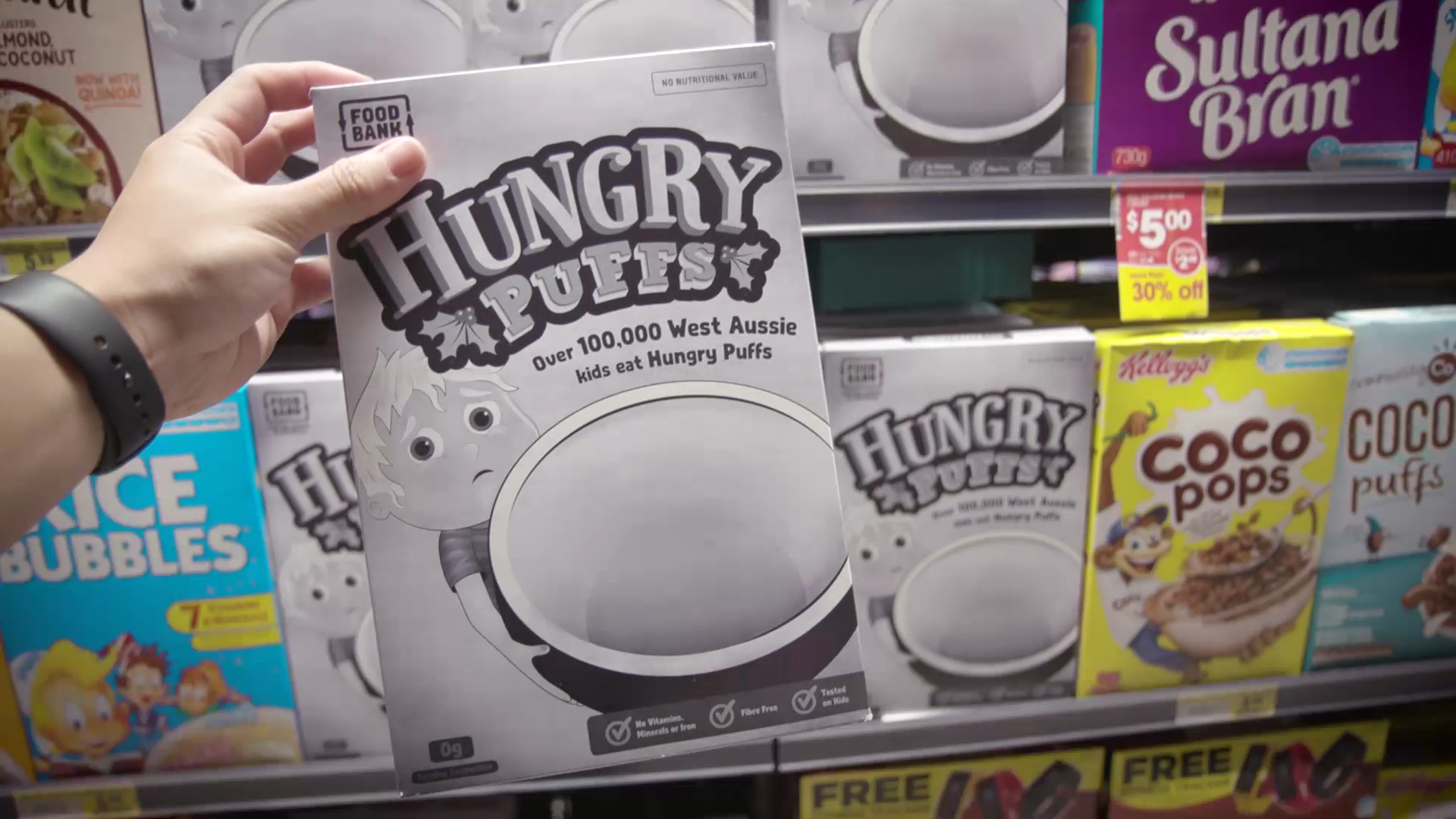 Despite being an empty box, we treated Hungry Puffs as you would any new retail product and looked for ways to stand out in a busy supermarket environment in the lead up to Christmas. We studied other cereal brands packaging and design techniques, deciding to use a series of popular cereal brand tropes, but with a stark, black and white design, and a few dark twists ? like the creation of a ‘sad child’ character and an empty bowl. Convincing over 40 major supermarkets across Western Australia to give up valuable shelf space was key to ensuring the campaign was big enough to make a real difference.