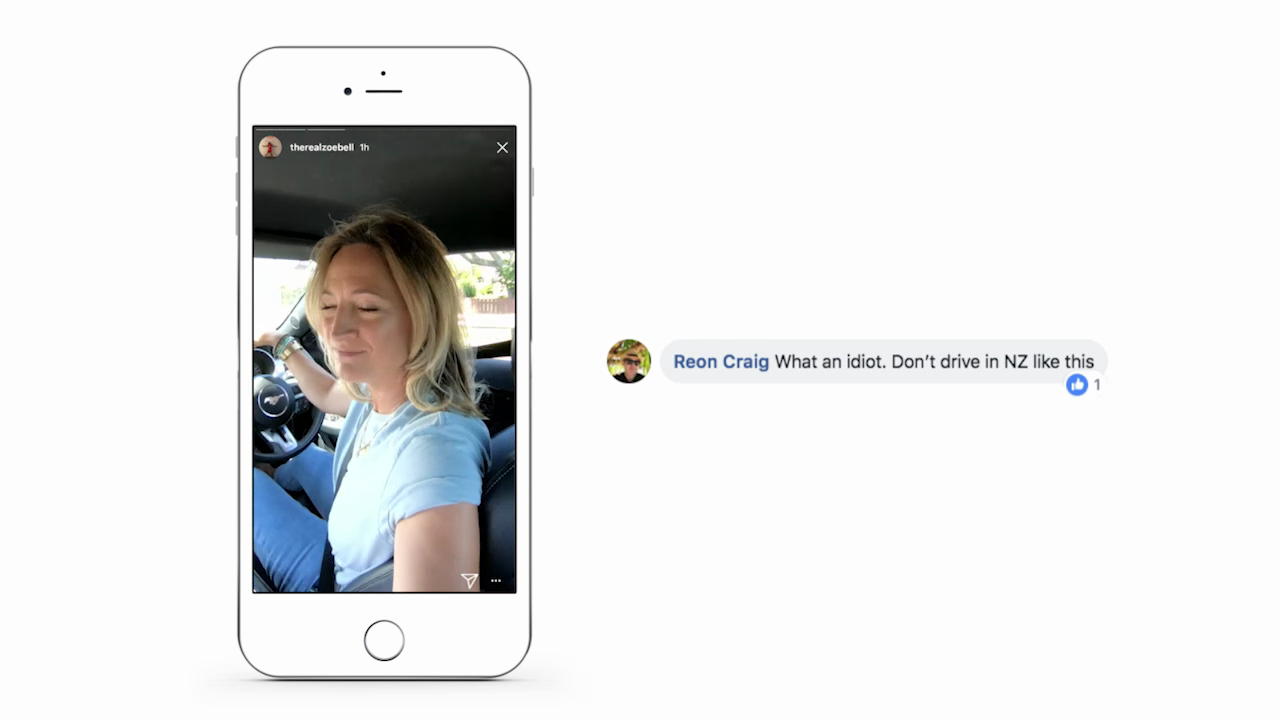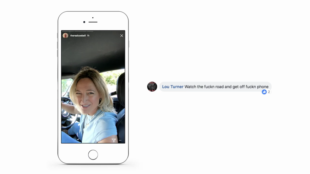 Using one of the problems as the media (mobile phone) Zoe shocked her fans by sharing a selfie video mirroring their dangerous driving habits.The video launched exclusively on mobile, starting on Zoe’s Instagram Stories, then Facebook and Twitter.