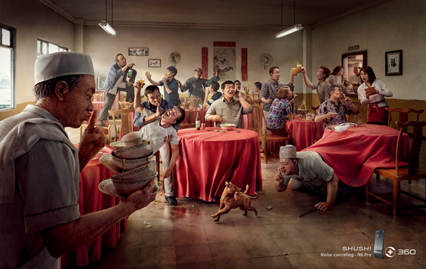 We found three representative noisy places in China: 1. food market, 2. train station, 3. big noodle restaurant, to highlight that under such noisy environments, the mobile phone still enables you talk freely without interruption. The humorous artistic treatment of exaggeration is applied to the characters. All the noisy people or animals in the environment are calmed by a "hush" gesture, creating a quiet speaking environment for the telephone user.