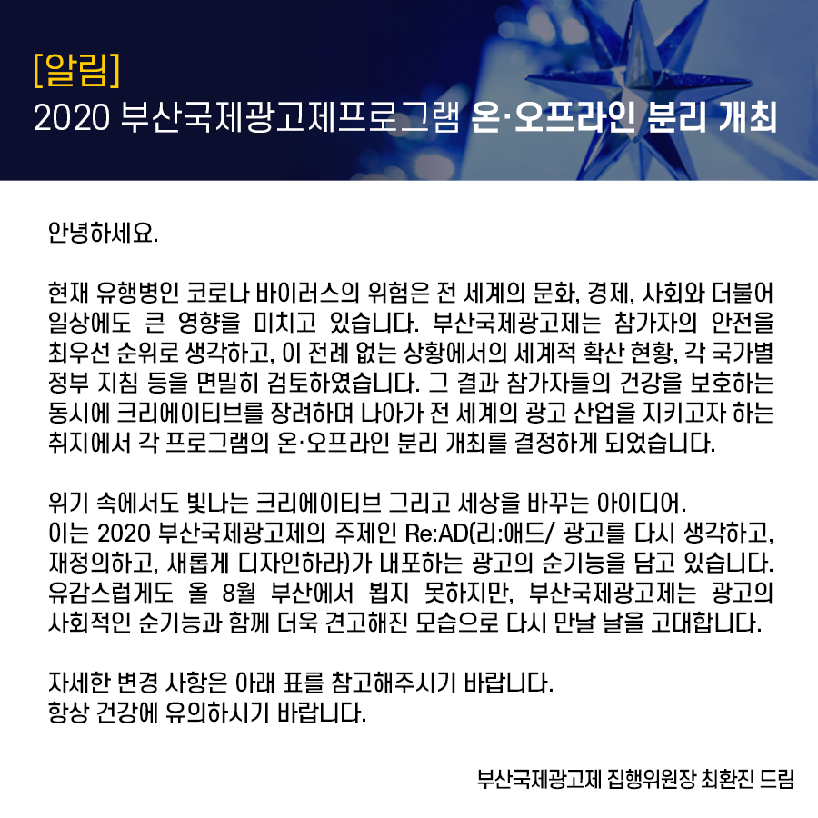 2020 부산국제광고제가 각 프로그램 온·오프라인 분리개최를 알려드립니다!