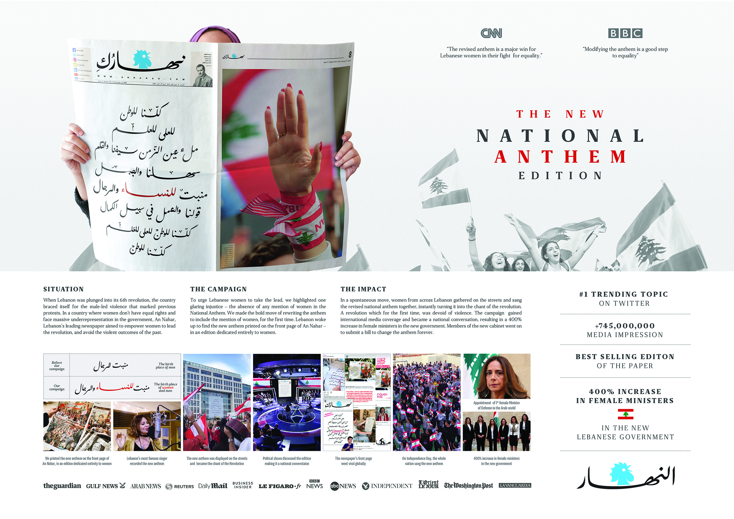 The day the new National Anthem was published, Lebanese women occupied the streets and sang it, turning it into the chant of the now peaceful revolution. People printed the anthem and hung it from buildings in the city. The campaign became the No.1 Twitter trend, drawing 745,000,000 impressions and $150 Million earned media. The edition became An-Nahar’s BEST-SELLING EDITION ever. The cover went viral globally and was extensively reported in the International press. On Independence day, the entire nation came together to sing the new National Anthem in its new peaceful revolution. The revolution transformed the historically all-male dominated cabinet by including 400% more female minsters, including the appointment of the first ever female Minister of Defense in any Arab country.