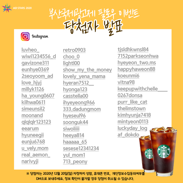 위 당첨자는 12월 20일(일) 자정까지 부산국제광고제 인스타그램 신규 계정(@adstarsfestival)으로