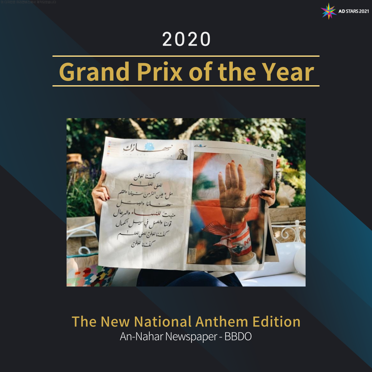 아랍에미리트의 임팩트 BBDO가 출품한 안나하르(An-Nahar) 신문의 ‘The New National Anthem Edition’이 수상의 영예를 안게 되었습니다
