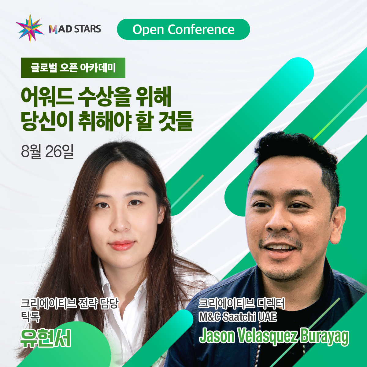 Z세대가 빠진 숏폼 플랫폼 ‘틱톡’의 Creative Strategist인 ‘유현서’님과 M&C Saatchi UAE의 Creative Director ‘Jason Velasquez Burayag’님 입니다!✨️
