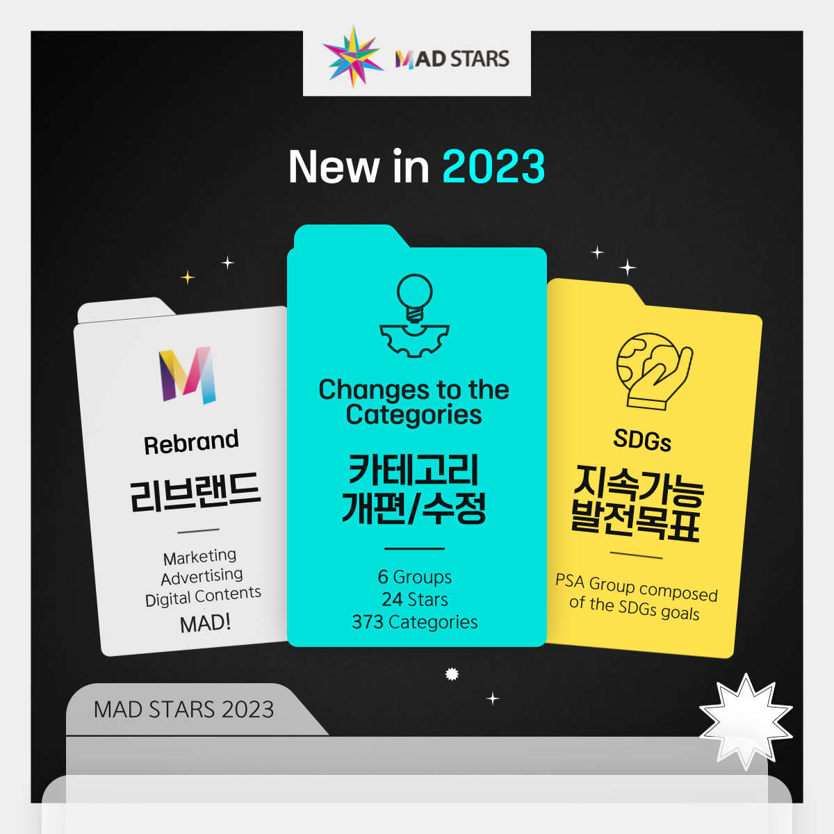 MAD STARS의 의미에 'Marketing, Advertising, Digital contents 등으로의 영역 확장'이 담긴 만큼, 올해 출품 카테고리 또한 이를 반영하여 전면 개편되었습니다.