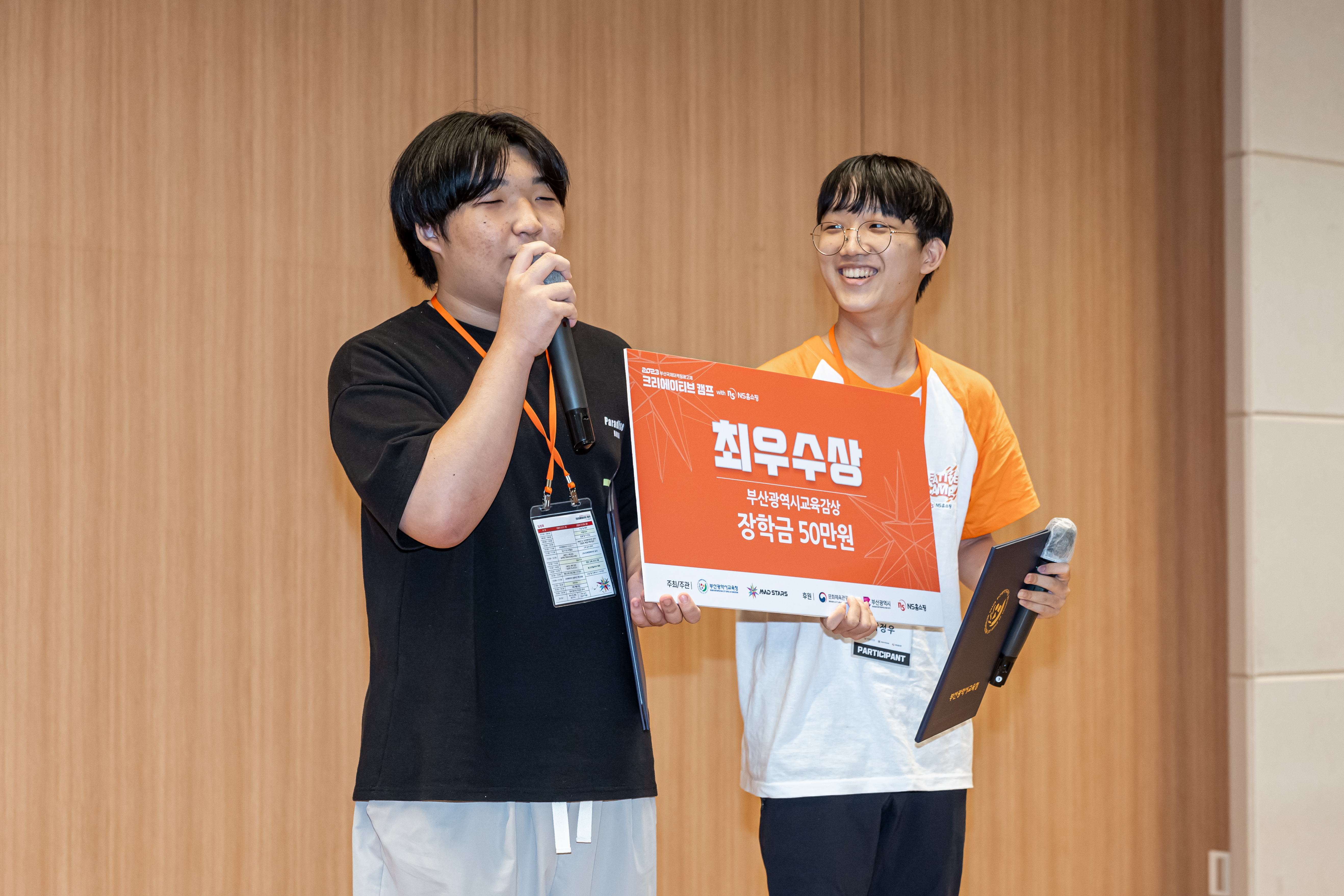 이번 캠프에서 참가자들은 제한된 기획 실습 시간 내 주제에 맞는 크리에이티브 솔루션을 기획하며, 팀별로 경쟁하게 되는데요. 이 중 상위 8개 팀에게 최우수상, 우수상, 크리에이티브상이 수여됩니다. 특히, 가장 우수한 1팀에게는 부산광역시 교육감 훈격의 최우수상과 상금 50만 원이 함께 주어집니다!