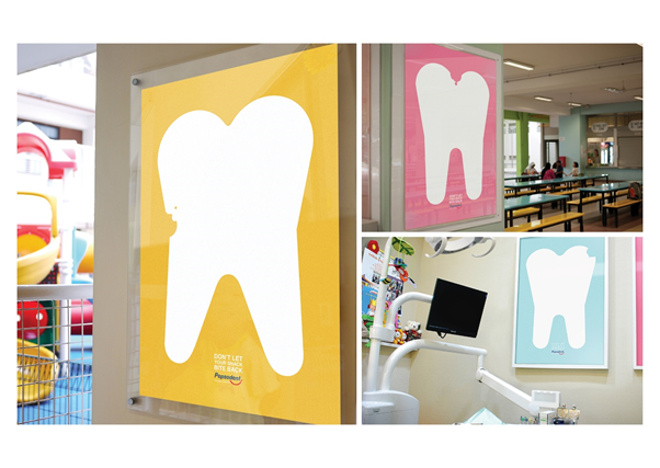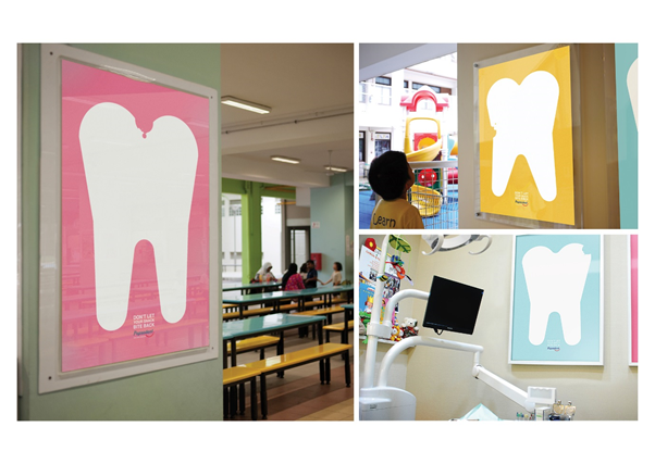 We reframed the fact that simple sugars in food are a common cause of cavities, and turned it into a series where the snacks people eat end up eating away at their teeth. To break through the clutter in the highly homogeneous oral care category, we took a distinctive, graphical approach that used facts and the charm of simple, cartoonish antagonists to depict the issue of cavities. These eye-catching designs draw the eye, before revealing the source of the cavity upon closer inspection. The series was placed in dental clinics, providing a bright, fun splash of colours in places that are often overly-sterile, intimidating and depressing to children. Placements n playgrounds and school canteens also gave us greater accessibility to children and adults-places where snacking is common, no less