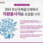 2014년 8월 18일(월)~8월 24일(일)까지 2014 부산국제광고제와 함께 할 자원봉사자를 모집합니다. 만 18세이상 대한민국과 해외 동포 및 국내에 거주 중인 외국인 모두 신청 및 참여 가능하며, 광고를 좋아하고, 사랑하는 예비 광고인 여러분도 환영합니다. 2014년 부산국제광고제를 빛내줄 또 하나의 별, 자원봉사자에 지금 지원하세요! 올 여름, 전세계 광고인과 예비광고인이 한자리에 모이는 부산국제광고제, 그곳에서 많은 활약 부탁드립니다! 1. 모집기간 및 지원방법 1) 모집기간 : 2014. 5. 2(금) ~ 5. 29(목) 2) 지원방법 : 부산국제광고제 홈페이지 (http://www.adstars.org)접속▷ ‘Contact us’클릭▷ ‘자원봉사 ’(http://www.adstars.or..